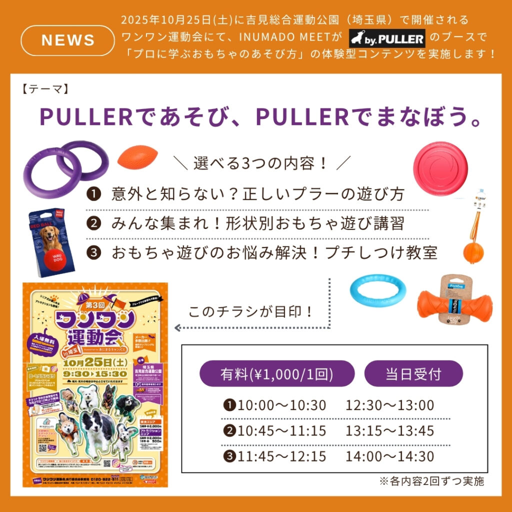 “第3回わんわん運動会”内のby.PULLERブースにて、PULLERであそび、PULLERで学ぼう!をテーマにプロに学ぶおもちゃのあそび方の体験型コンテンツを実施しました。