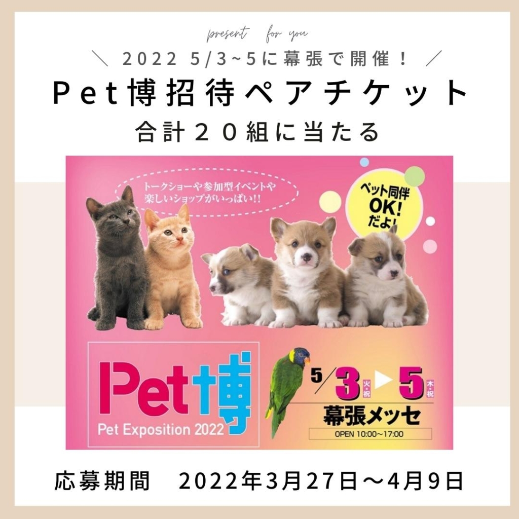 イベント概要 Pet博2022 幕張会場 日時 2022年5月3日(火・祝)~5日(木・祝)10:00~17:00 場所 幕張メッセ:千葉市美浜区中瀬2-1 アク…